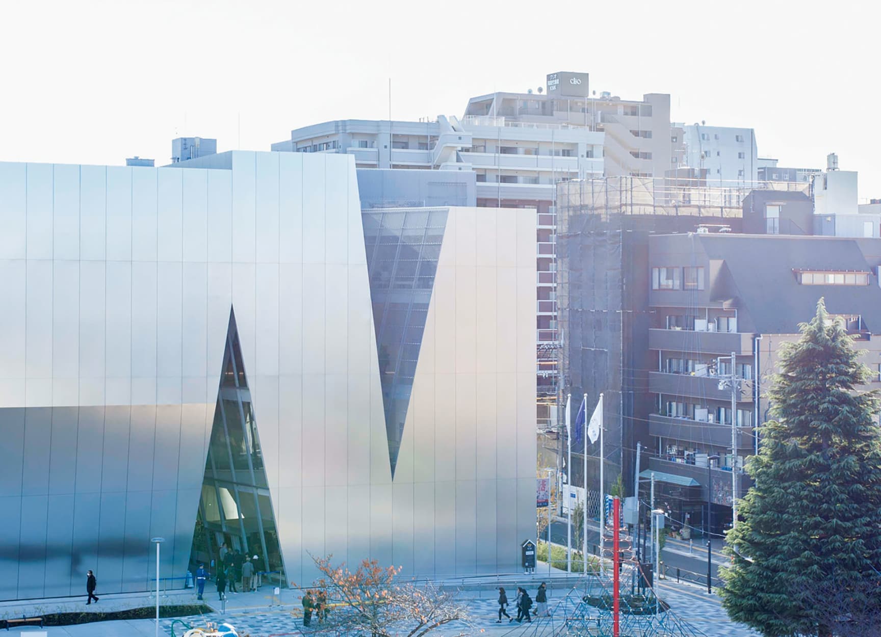 2016年竣工。設計:妹島和世。葛飾北斎が暮らした街に生まれた北斎作品を展示する美術館。浮世絵は紫外線で退色することから遮光を目的にアルミパネルで全体を覆う。街の風景を映し込む淡い鏡面仕上げのパネルで、圧迫感なく下町に溶け込むことを目指した。同じく建物が分割したかのような印象を与えるスリット状の開口部に窓やアプローチを設けてボリューム感を抑え、四方からアクセスを可能に。